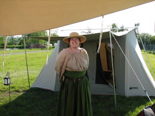 The weekend over all was quite fun and though mildly marred by occasional torrential downpours on Saturday and a air mattress with a leak on Friday evening, it went off without a hitch. I've included a photo of me in my finished Chemise and a skirt made "just because" Thursday evening prior to the weekend as well as one of our camp right after I finished setting up Friday.